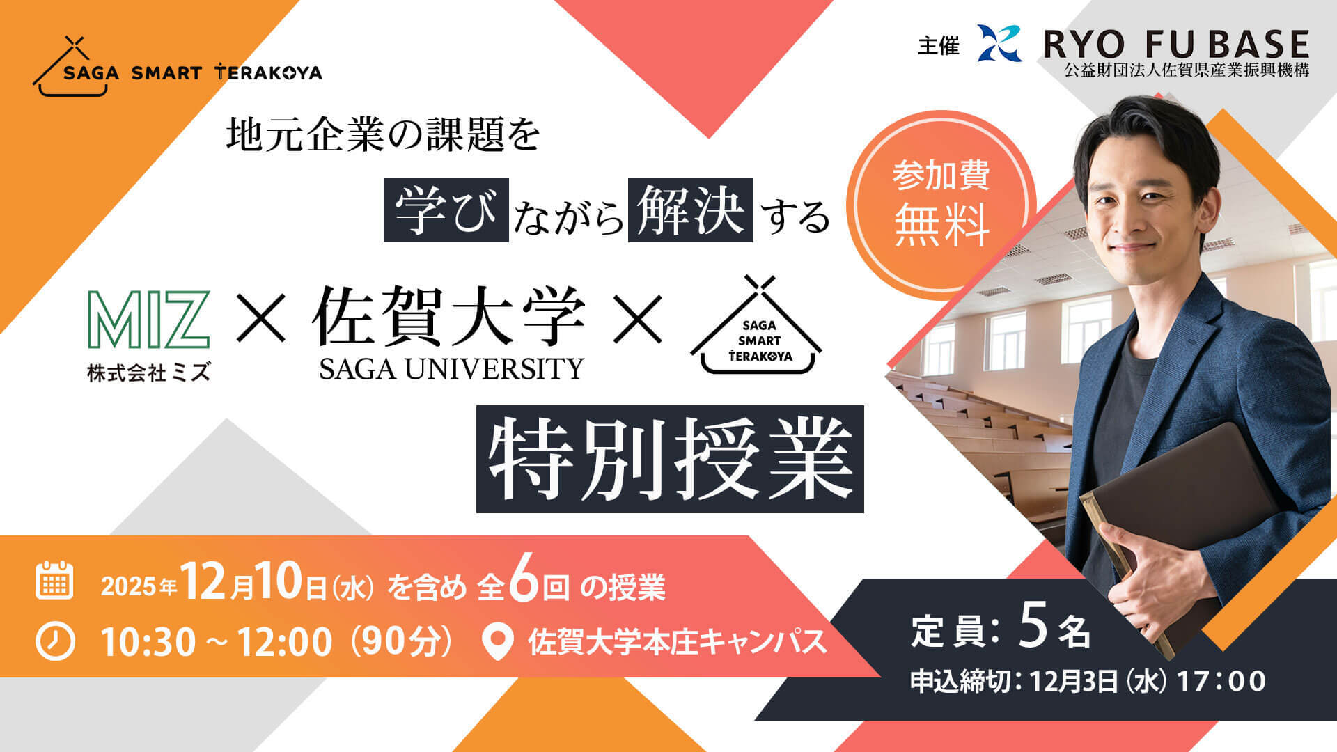 佐賀大学の正規授業に参加できるまたとない機会です!現役大学生と共に、佐賀県が健康長寿日本一になることを目指す株式会社ミズ様の【会員制の健康長寿実践塾】事業をテーマとしたプレゼンテーションに挑戦していただきます。